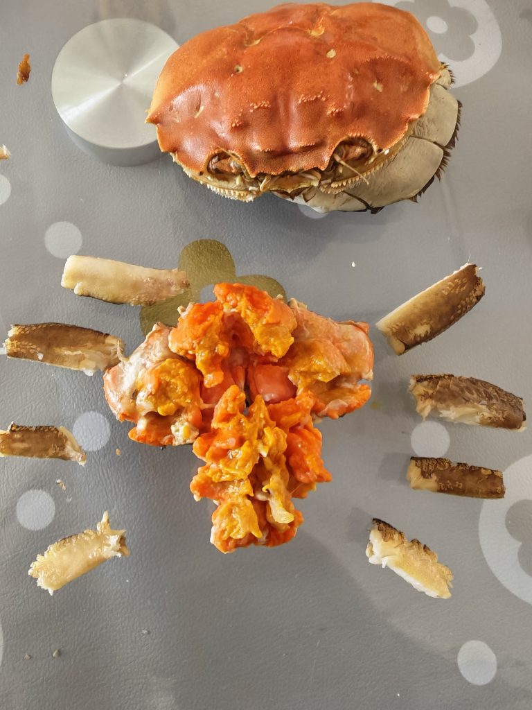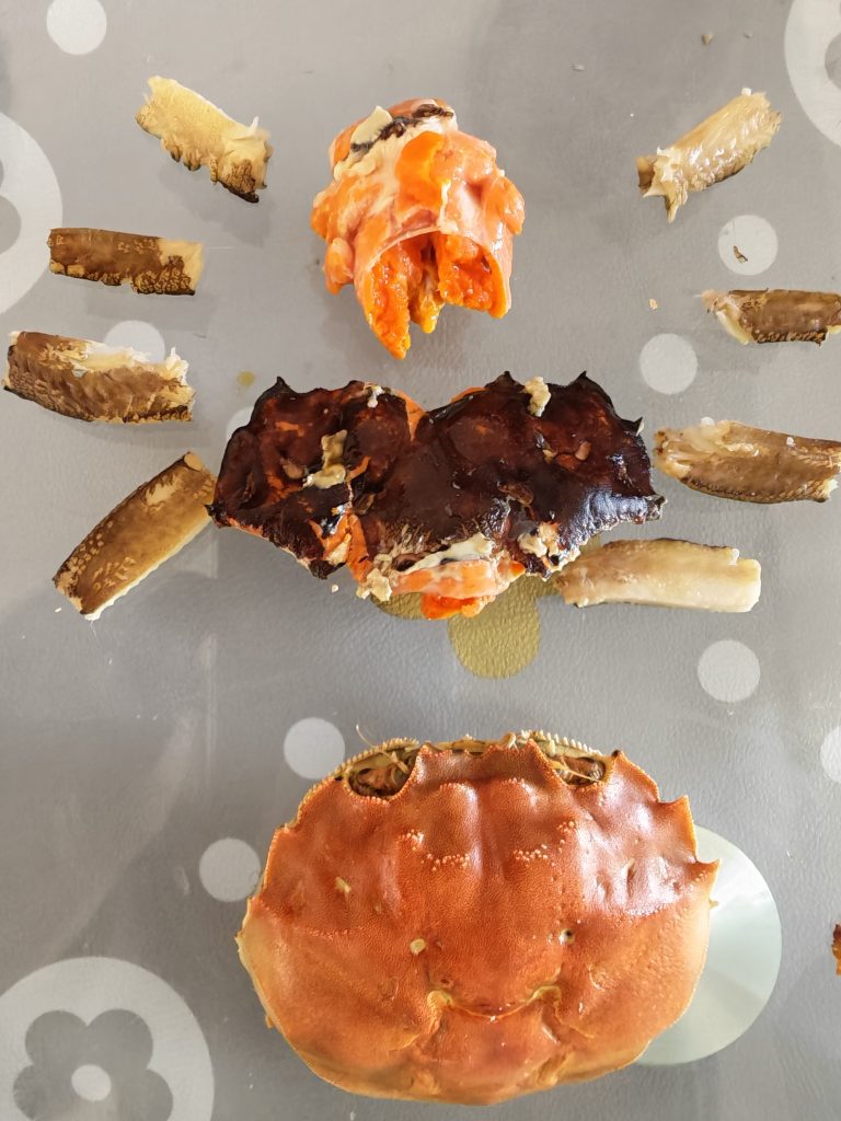 说实话,孩子在吃螃蟹这方面比我要强的多,几乎一点也不浪费,甚至还用上了镊子,把不该吃的、没营养的蟹心、腮什么的剔得干干净净。对于这种有些艺术的吃法,让我甚至有点叹为观止:“吃货”的名字果然不是白叫的。